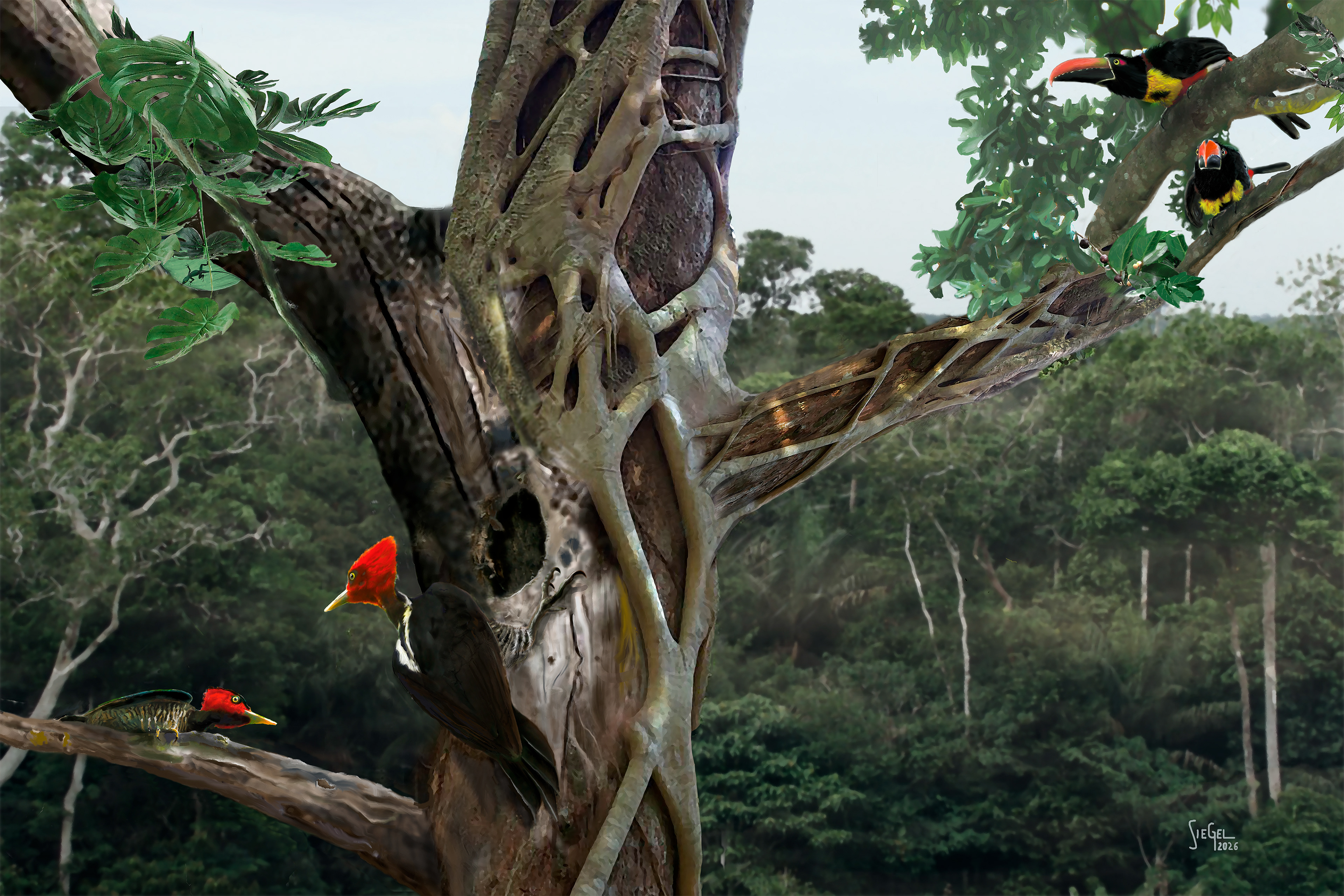 In the Central American rain forest a pair of Pale-billed Woodpeckers are excavating a nest in an old tree, covered in Strangler Fig. From a leafy part of the tree, a pair of Fiery-billed Aracaris (small toucans) wait and watch. Toucans eat more than fruit and breakfast cereal. They love eggs and baby birds, and will enter other birds' nests to get them. In this case, however, they may want to take the hole for themselves once the work is done.